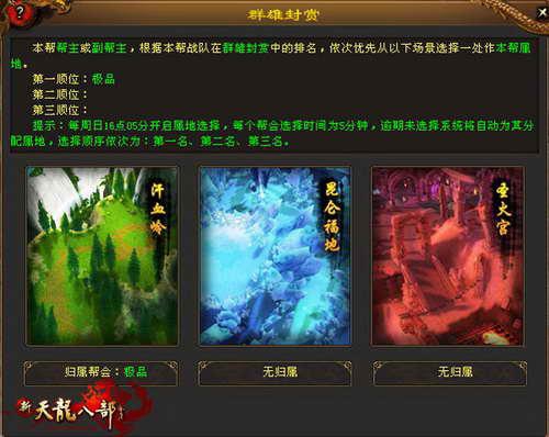 周一至周六0点-8点为属地维护时刻。属地维护期间,不带杀气的帮会成员在属地,击杀任何人或被任何人击杀均不会受赏罚,带杀气的成员在属地被击杀仍会遭到赏罚。非属地帮会的玩家,只要不是反杀占据当前属地帮会成员,均会遭到高额杀气赏罚哦。 周一至周六每天开启镇守属地活动。三个属地将会各呈现6个前来夺宝的江湖枭雄、江湖匪首和绿林响马。所有玩家均可组成3人以上部队前往属地击杀,得到坠落黄金、白银、青铜三种虎印,虎印可在对应属地的王旗处兑换属地奖赏。没有归属的属地不会呈现Boss。 Boss死亡时会坠落一个宝箱,所有玩家均可争夺宝箱,但宝箱同时只能有一人开启。终究翻开宝箱的玩家,全队成员均可取得奖赏,部队中具有属地的帮会成员,将取得双倍奖赏。 真英雄,就要带领兄弟们走向光辉!真豪杰,就要为了帮会的荣耀征战沙场!属地争霸,不仅仅是实力的考验,更是责任感的表现!本周战况现已告一段落,且看下周,众英雄怎么各施绝技,夺得属地,成果霸业!