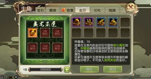 主要影響放置在盤龍玉匣內的金印的特點加成,俠士能夠經過註入人物經歷或運用【篆刻心經】來提高盤龍玉匣等級,盤龍玉匣等級越高則懷璧值越高,懷璧值越高則特點加成越多。 想必俠士們最為關心的,就是金印的獲取方法了~新資料片更新後,當俠士集齊某壹種金印碎片後,可在乾坤袋中進行合成;而剩余的金印碎片可在混元囊中提煉為【金晶】。