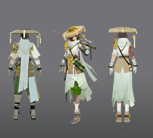 英雄莫問出處,豪情盡在不言中。丐幫高級時裝全體別具巧思,富有一種大巧不工的別致美學顏色。頸肩與下擺處選用國風美學中湛青色海濤江崖紋的規劃,象征丐幫弟子以厚德載物的仁心與好男兒誌在四方豪情。      最令人印象深入的莫過於時裝混搭的潮流規劃,木質甲胄、黃金飾品、絲綢、緞帶多種元素交錯相融,並不給人沖突感,古典質樸的氣質反而與丐幫弟子粗獷豪邁的性格相輔相成。