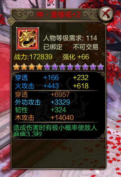 重楼配备特点强于以往的神装,95级重楼>125级旧神装,重楼配备可百分比进步生命,高档重楼可再进步神装养成上限,加量不加价!每件重楼配备顺便一个特别的配备技术。