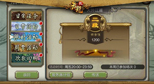 60級以上的玩家每周五在[天外江湖]服務器可報名參加多場競技。比d後,系統將依據玩家在PK中的體現贈予榮譽值,獲得的榮譽值越多段位排名將越高。