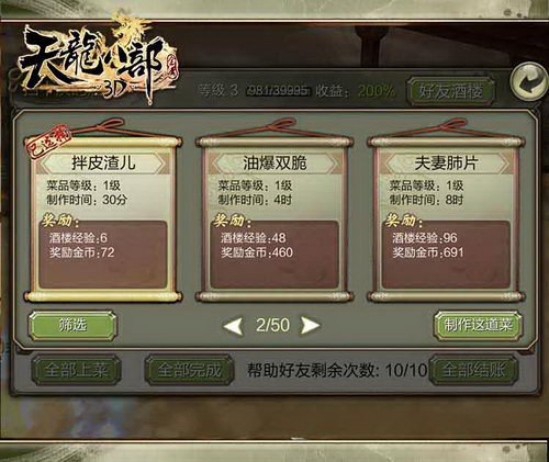 《天龍八部3D》中酒樓體系給玩家提供了一個把美好感傳播給他人的當地,一道道美食,一桌桌賓客,一千雙手就有一千種味道的呈現,眾豪俠圍坐一堂,各抒己見,談天說地,訴說江湖趣事,敘述武俠傳奇。 從個體生命的遷徙,到食材的交流運輸,從烹調方法的演變,到人生命運的流通,人和食物的倉促腳步,從來不曾停歇。就像江湖日子一樣,離心離德。 刀光劍影充滿著日子中的點點滴滴,在快節奏的日子中找到一絲恬靜,靜靜地坐下來享受一頓美食,舒緩下因為緊張的神經也是不錯的選擇。 盡管一日三餐,幾乎成為人類共同的飲食製度,相同的飯食在中國,卻變幻出不同的日子節奏,塑造出各異的人生感觸。 心境影響著食物的質量,相同影響著閑散俠客的來訪,出色的食材做出的食物足以吸引來喬峰一樣的尖端俠客,可見俠客們對於美味也都有著獨到的見地。
